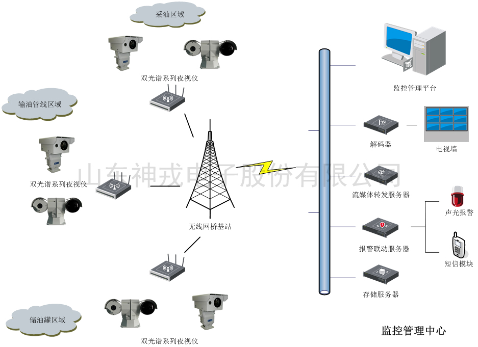 近年來,自身的夜視技術逐漸被引入到油田的視頻監控系統中,發揮了巨大的作用。神戎公司根據多年的應用經驗,基于自身的激光夜視儀、紅外熱成像、智能視頻分析技術開發出了油田智能監控系統。該系統用于采油井、輸油管和儲油罐的視頻監控,可以滿足監控范圍大、隱蔽性強、全天候連續工作、防潮、耐腐蝕、防雷擊等要求,已應用于勝利油田、大慶油田、克拉瑪依油田、中原油田、河北油田、大港油田等,取得了巨大的社會效益和經濟效益。