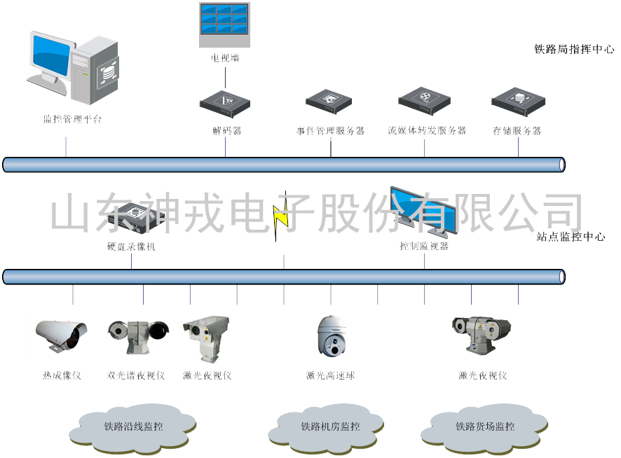 神戎公司基于自身的激光照明和紅外熱成像技術,開發出了鐵路視頻監控系統。該系統基于網絡架構,能夠實現鐵路沿線(包括橋梁、隧道、咽喉等)、貨場、機房等室外全天候24小時視頻監控,實時提供鐵路運營、安全狀況。當有突發事件時,站點或鐵路局監控中心的軟件系統可以及時提供現場畫面,記錄事件發生的時間、地點,進行報警聯動處理。
